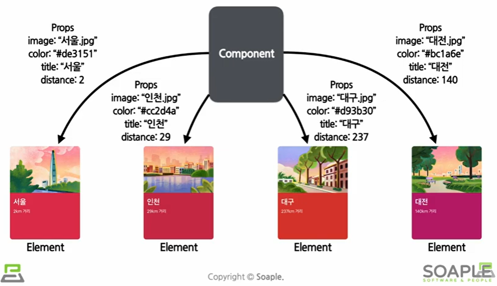 하지만 Props (속성)가 다르기 때문에 각각 다른 이미지와 지명을 나타낼 수 있는 것이다.
