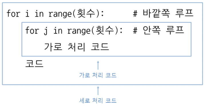 ※ 바깥쪽 루프가 세로 방향, 안쪽 루프가 가로 방향을 처리한다는 점을 기억하기