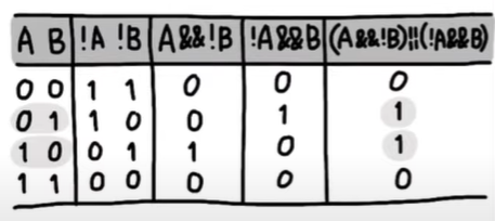 Tip : 이러한 논리연산을 XOR(exclusive or, 배타적 논리합)연산이라고도 부른다. 이를 표현하기 위해서는 (a AND (NOT b)) OR ((NOT a) AND b)처럼 하면 된다.