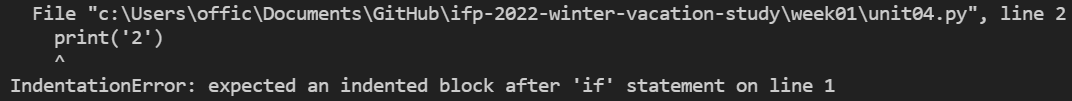 - 코드를 읽기 쉽도록 일정한 간격을 띄워서 작성하는 방법이다. 특히 파이썬은 들여쓰기 자체가 문법이다. -> if의 다음 줄은 항상 들여쓰기를 해야하고 만약 하지 않으면 문법 에러가 발생한다.