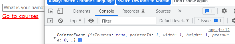 이때 handleLineClick() 함수에 event를 인자(argument)로 넣어주면 이 event가 어떤 종류인지, 좌표가 어디인지 등 다양한 정보를 얻을 수 있다.