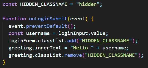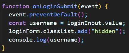 먼저 form의 submit이라는 기본 동작을 막아주는 preventDefault()를 사용한 다음 username을 loginInput.value에 저장해 주고, loginForm에 hidden이라는 class를 추가해주는 코드를 작성했다.
